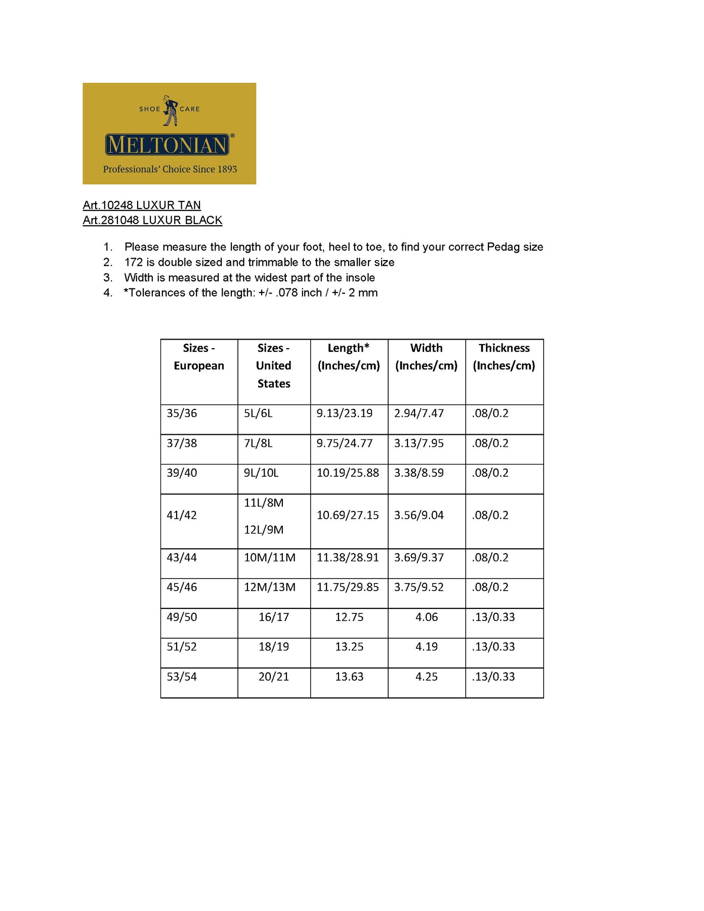 Meltonian® Luxur is flat genuine sheepskin leather replacement insole with soft latex cushion and odor absorbing activated charcoal. Perfect for dress and casual shoes. Trimmable. Comes in Black and Tan colors Tacco Luxus 613