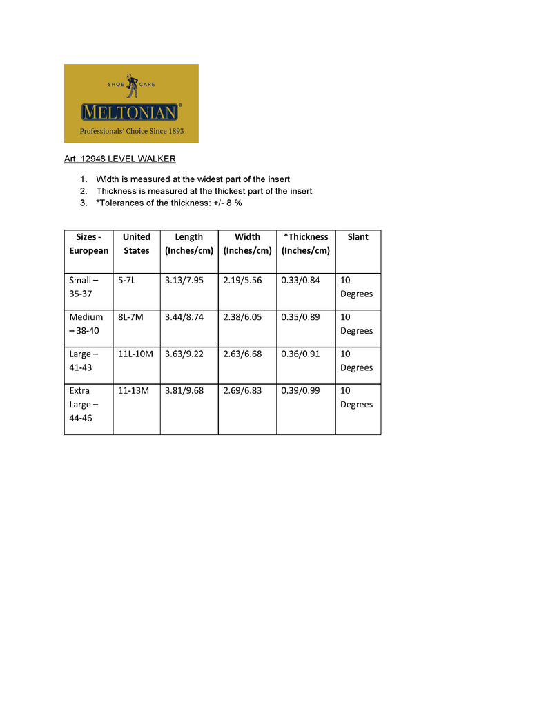 Meltonian Level Walker is shock absorbent heel wedge made of genuine leather and uneven slated latex pad. Often used to correct bow legs and over-supination. Alleviates discomfort from supination and corrects ankle alignment, reducing excessive shoes heel wear on the outside.