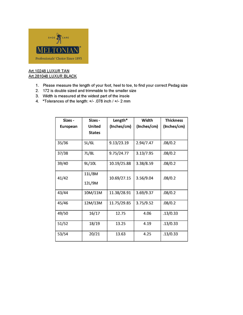 Meltonian® Luxur is flat genuine sheepskin leather replacement insole with soft latex cushion and odor absorbing activated charcoal. Perfect for dress and casual shoes. Trimmable. Comes in Black and Tan colors Tacco Luxus 613