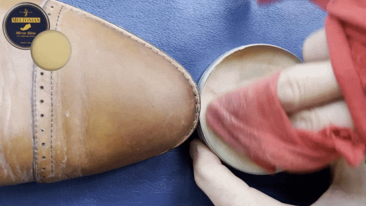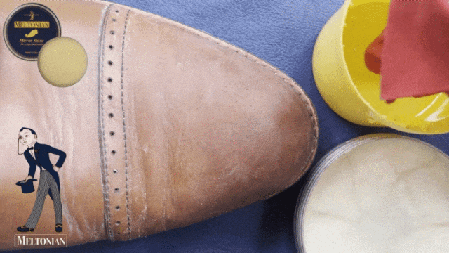 It is highly recommended to apply Meltonian Mirror Shine on top of Meltonian Shoe Cream Polish. The hard wax has to be applied in thin layers on the areas where shoes do not bend, such as toe ends, so it does not crack.